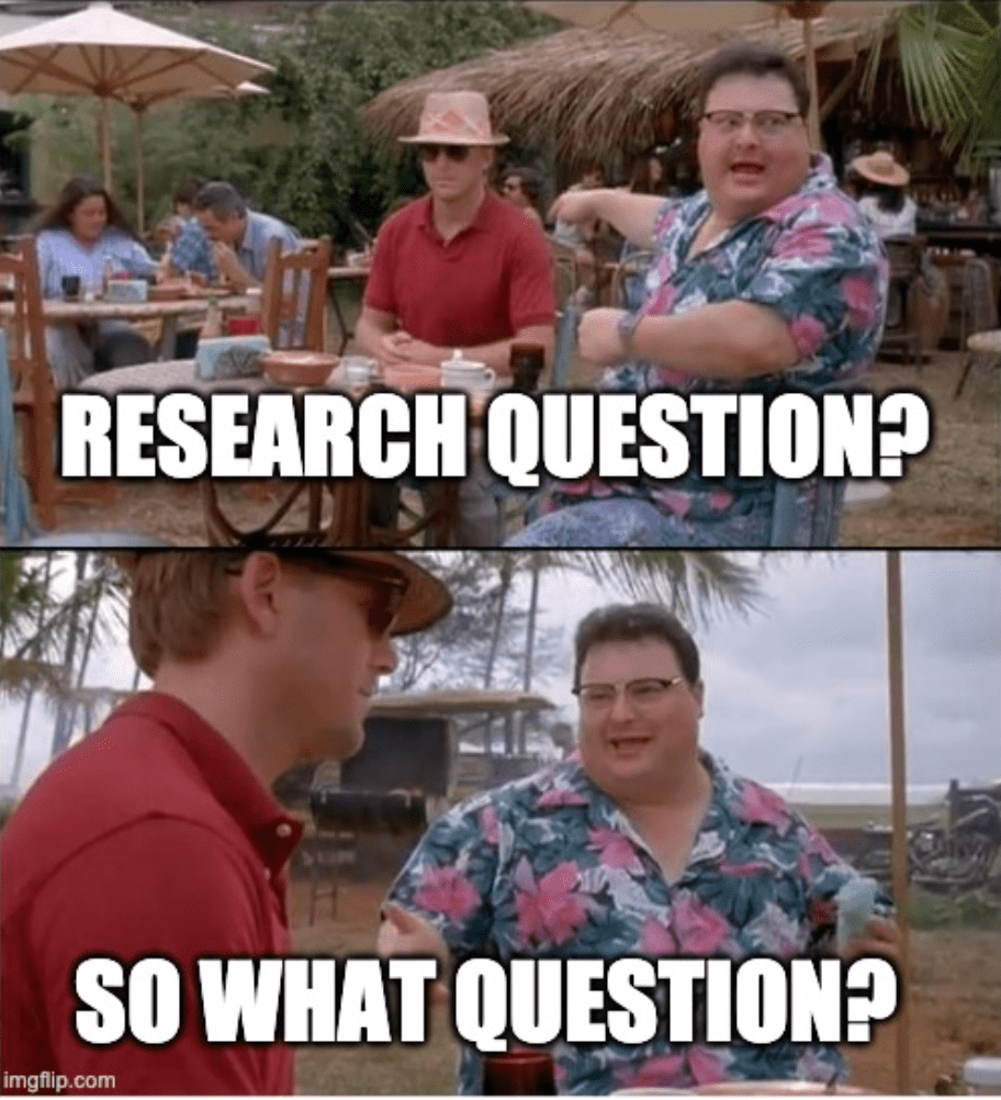 But, after having this possible great question, which I guess I am far from producing one good at the moment, meaning that more tinkering must occur. A further test to a possible research question is the «so what?» type of question, like for example the Jurassic Park «… nobody cares» Meme